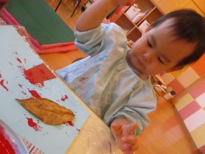 公園や散歩に行った時に拾った葉っぱを使ってスタンプあそびをしました![]()