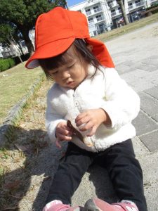 今月の月刊絵本がちょうど落ち葉についてのお話だったので、葉っぱの大きさや色、葉っぱの穴などにも興味津々の様子![]()