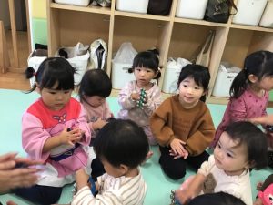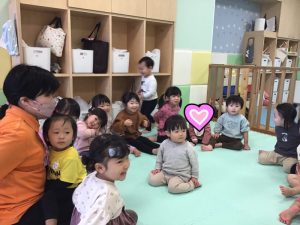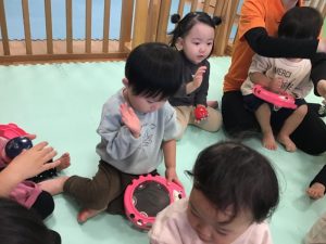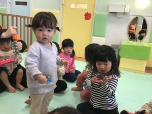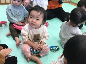 みんなでげんこつやまのたぬきさんの手遊び歌をしてから、メリーさんのひつじではピアノに合わせてリズムをとりながら楽器を演奏しています( ^ω^ )♡
