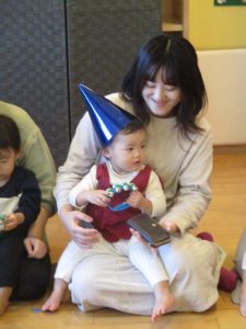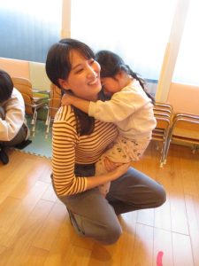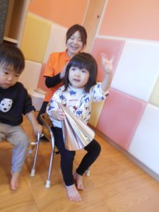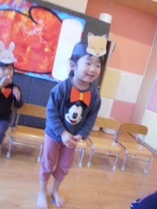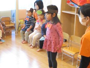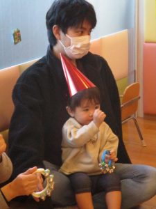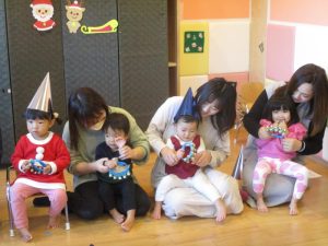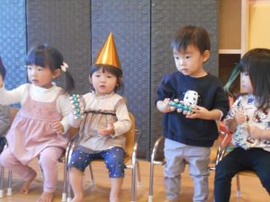 まずは子どもたちの大好きなうた『どんぐりころころ』と鈴でのリズムあそび『おもちゃのチャチャチャ』を披露しました![]()