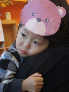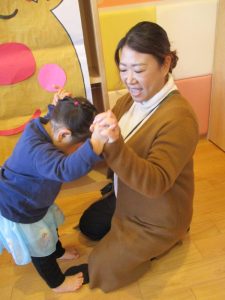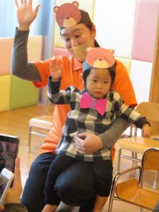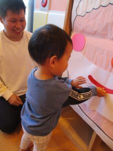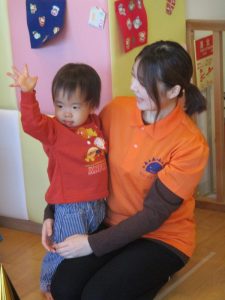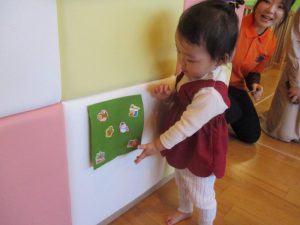 保育者の問いかけに『うん、うん』と頷いたり、お名前を呼ばれると手を挙げて返事をしたり、よくできました💮