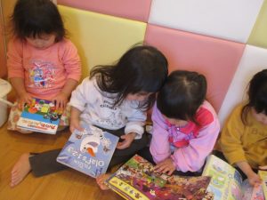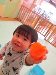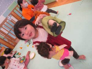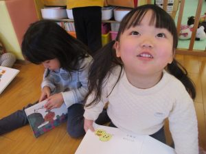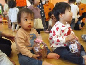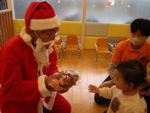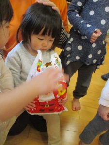 もらったプレゼントはそれぞれかばんの中に収めていたのですが、『入っているかな~?』と確認したり指を差しながら『プレゼントもらった!』と伝えようとしたり、子どもたちにとって嬉しいひと時となったようです