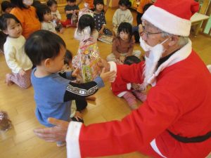 ちょっぴり照れくさそうにしながら受け取る子ども、サンタさんの顔をじーっと見つめる子ども・・