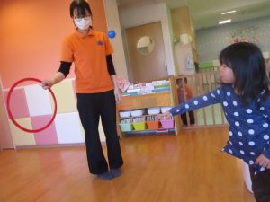 続いて、先生が持っているフープを目掛けてボール投げです![]()