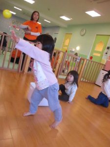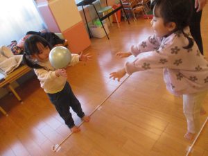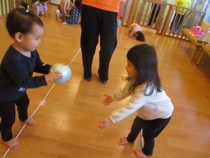 お友だちとの共同作業は楽しく、ボールが落ちても駆け足で取りに行く様子はとても微笑ましいです![]()