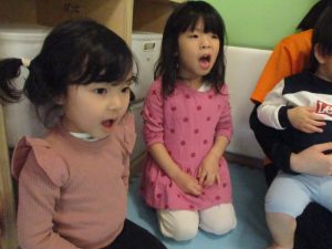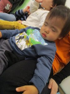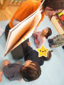 この日は午睡前の読み聞かせタイムだったのですが、お話が終わることにはウトウト眠ってしまうお友だちもいました![]()