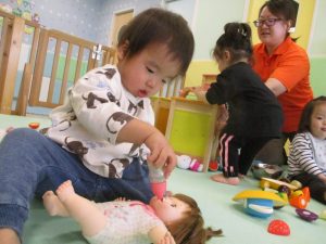 保育室に差し込む春の優しい日差しが、子どもたちを暖かく包んでいるようです。