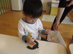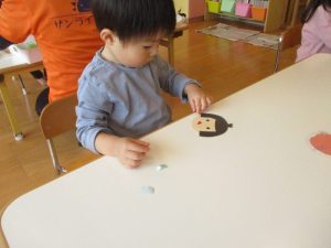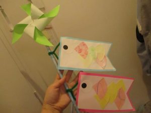見本とこいのぼりのイラストを見せると「おさかなー!」と嬉しそうな子どもたち😊