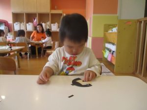 こいのぼりの形の画用紙にフィンガーペインティングをしましたが、とっても楽しそうで意欲的に取り組んでいました🎨