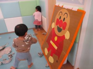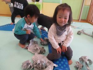 この日は新聞紙遊びだったので、新聞紙を丸めてボールにしたものを降らせたり、バランスウェーブのなかに入れて、プールのようにして遊びました🤗ボール遊びの日にボールプールにすることもできます❗