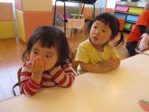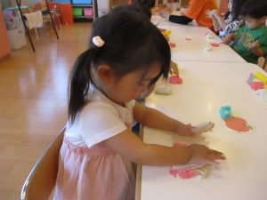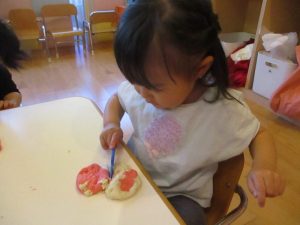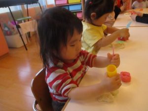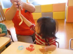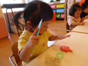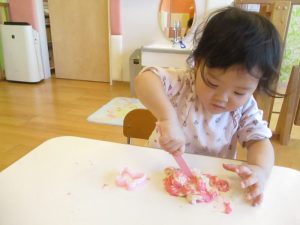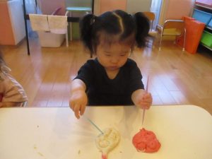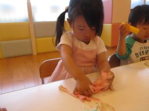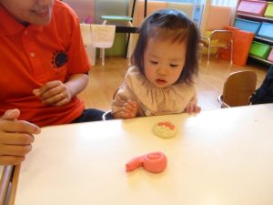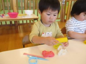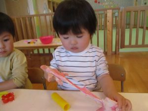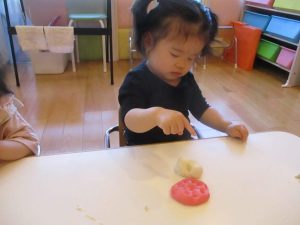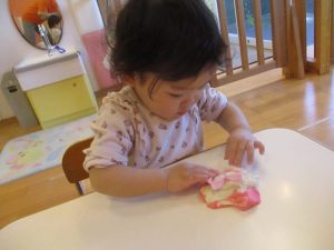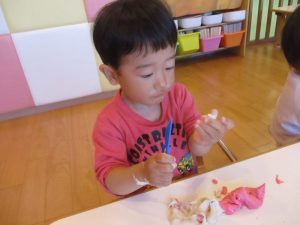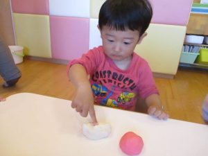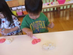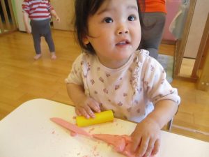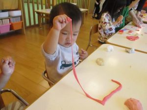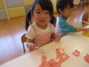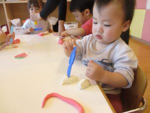 いちご組さんは今年度初めての粘土遊びで、少しとまどいもみられましたが、慣れてくると遊び方もだんだんダイナミックに‼