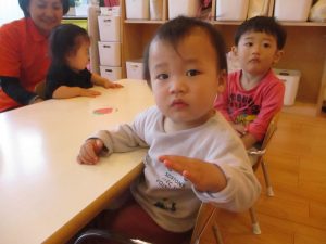 保育者にアンパンマンやかたつむりを作ってもらって、なんとも言えない表情😂