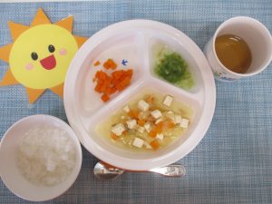 (写真は後期食です。月齢によって形、固さ、盛り付け量を変えて提供しています。)