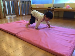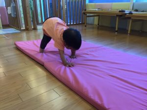 マットの上でクマのようにハイハイをしています🧸