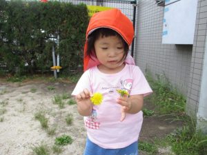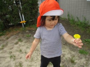 探索ではたんぽぽやシロツメクサが咲いていて、見つけると保育者に見せにきてくれます🌼