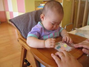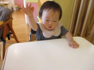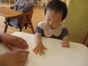 ジップロックに入った絵の具の感触に不思議そうな顏をしていましたが、ぎゅっと握ってみたり、指で押してみたりと絵の具の感触を楽しむことができました🌟