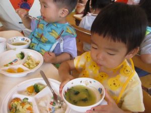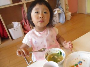 子どもたちがちぎった小松菜で、給食の先生がみそ汁を作ってくださいました🍜