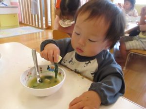 「こまつな?ちぎちぎ?」と自分たちでちぎった小松菜に興味津々で、いつも以上に勢いよく食べていました🥰