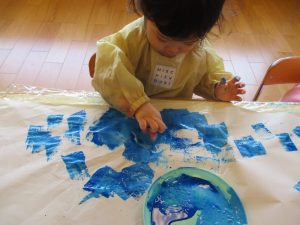 みんなで大きな紙にスタンプ遊びをしたので、ダイナミックでステキな作品になりました😊