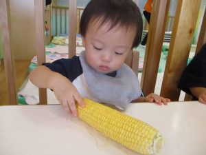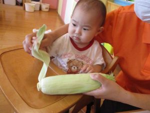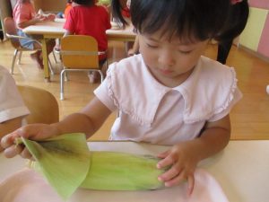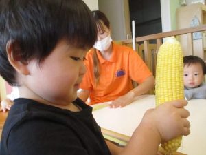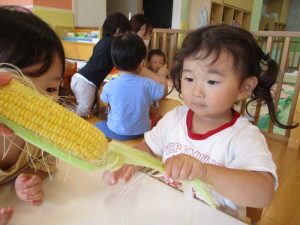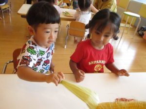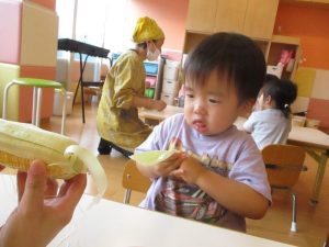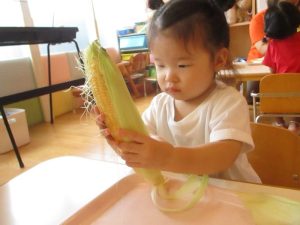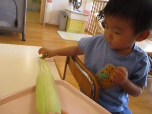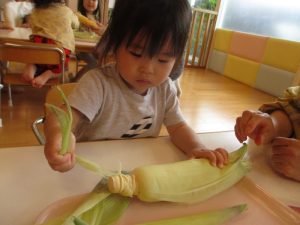 もも組さんも、先生と一緒に剥き剥きしました🌽