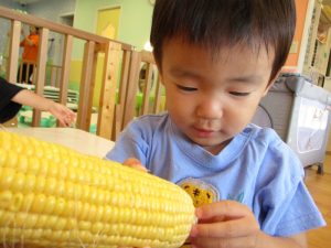 なかなか目にする機会のない皮付きのとうもろこしに興味津々な様子の子どもたち😊