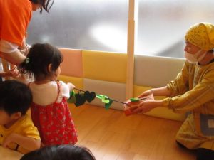 保育者たちは子どもたちが噛まれないように必死です(笑)