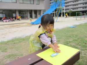 見つけた折り紙を先生に渡して、本物のお菓子と交換です✨