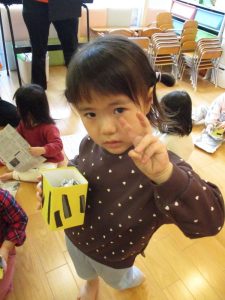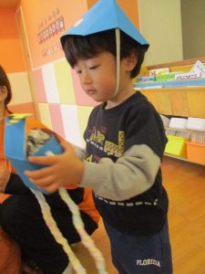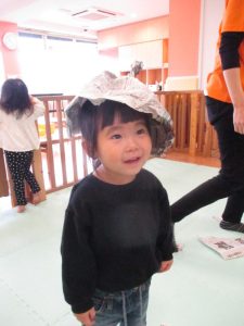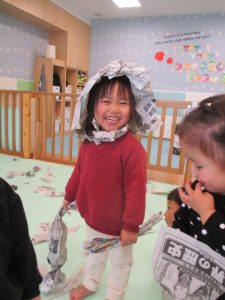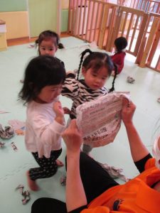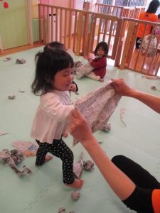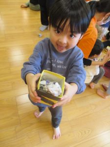 絵本を見て節分について知ったところで、みんなの豆入れに新聞紙で作った豆を
