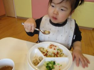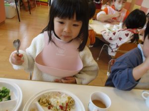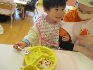 節分会の日の給食は、ケチャップで可愛らしいおにが描いてありました💕