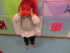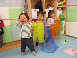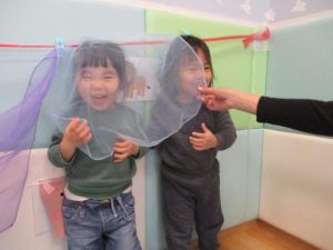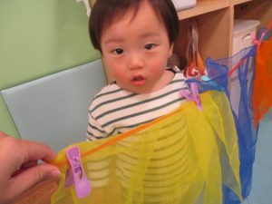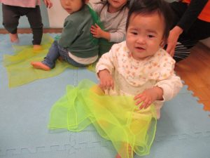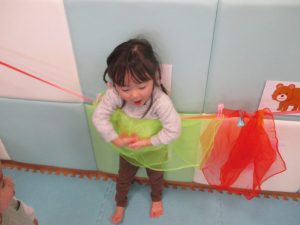 もも組さんもスカーフの感触に触れたり、いないいないばぁ遊びを楽しみました😊