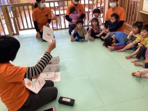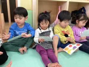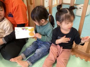 「あったー!」「strawberryよ!」と楽しそうにカードの果物を指差しながら歌っていました![]()