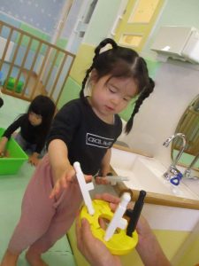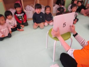 こちらはリトミックで『てをたたきましょう』を歌っている場面です![]()