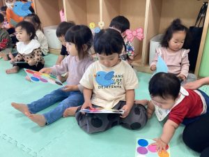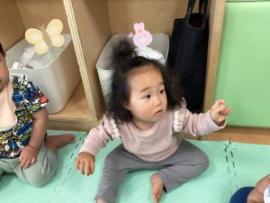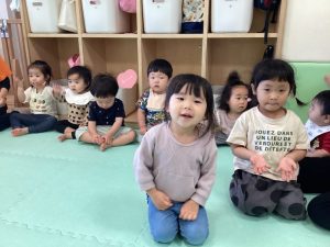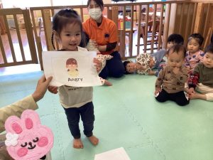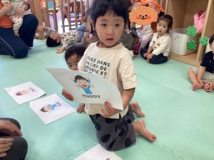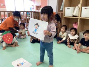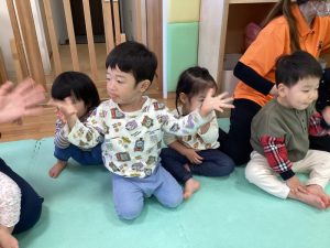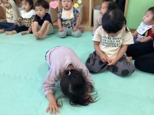 初めて英語のカリキュラムに参加する子は不思議そうにしながらも保育者の真似をしながら楽しそうに体を動かしています![]()