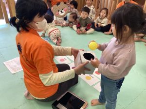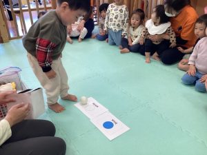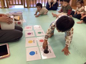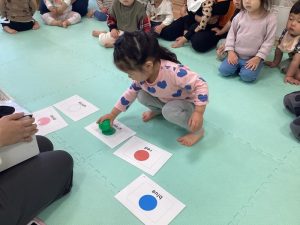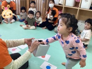 箱からボールを一つ取り、英語で言って同じ色のカードに置くゲームをしました![]()