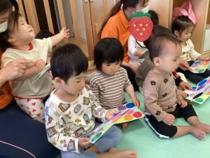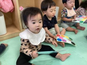 カードの中に歌で聞こえた色を見つけると「ここ!」と嬉しそうに触っています![]()