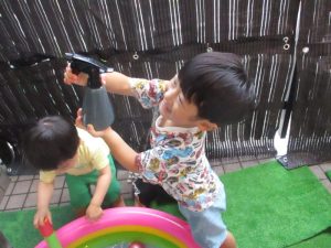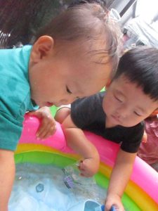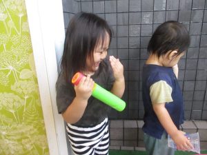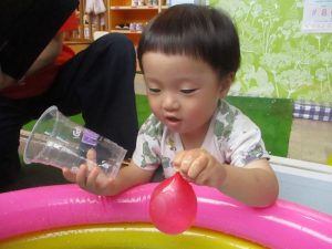 水風船やジョウロなどのおもちゃを使いながら、それぞれのペースで楽しんでいます