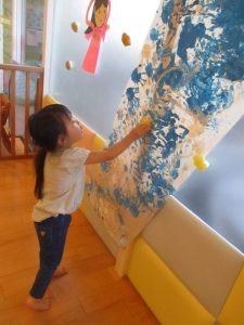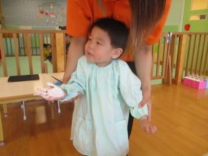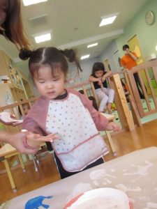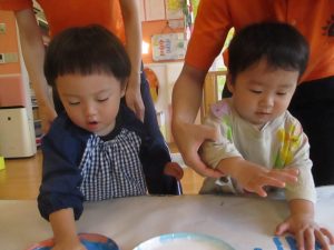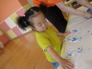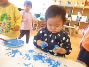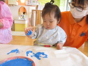 絵の具の感触にも慣れてきたようで、手形をつけたり手のひらで思い切り絵の具を塗り広げたりと大胆な姿も見られました