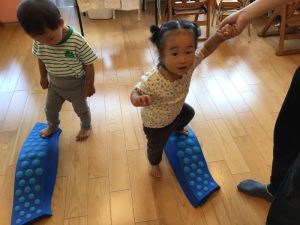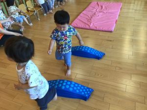 マットの上を歩いたり、ウェーブバランスを登ったり降りたりしながらバランス感覚を養います![]()