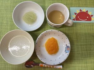 (写真は離乳食後期です。年齢によって形、固さ、盛り付け量を変えて、提供しています。)