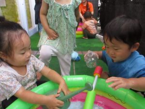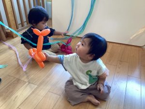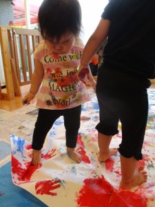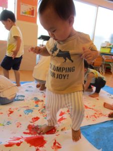 保育者の『ペタペタ』という言葉にだんだんと勢いがつき、ダイナミックに手を伸ばしていました![]()