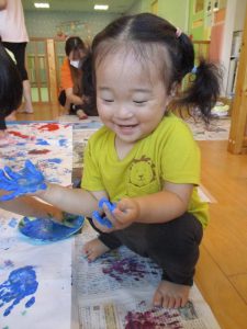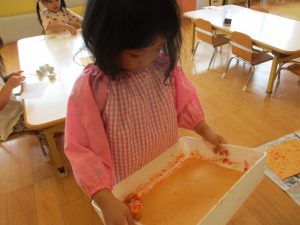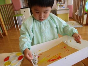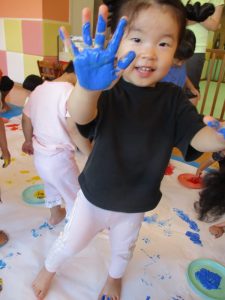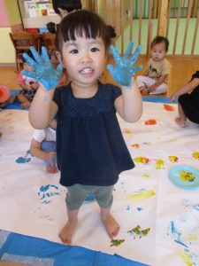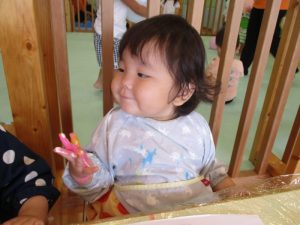 絵の具にそっと手を伸ばし、手についた絵の具をじっと見ていたもも組さん![]()