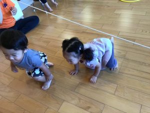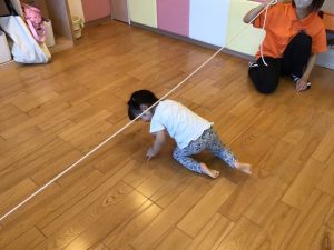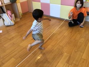 フープを使ってけんけんぱをした先には…なわくぐりが待っています![]()