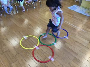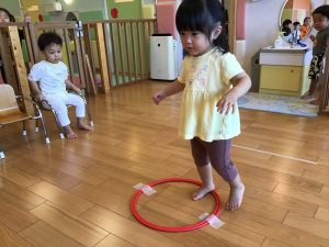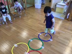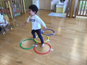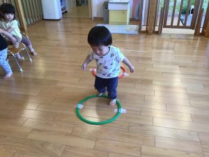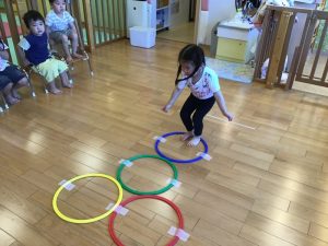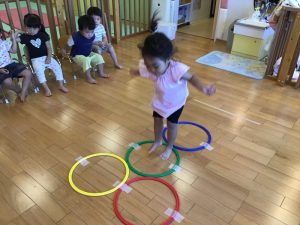 けんけんぱでフープを跳びます。