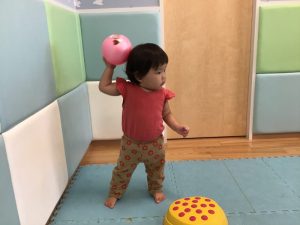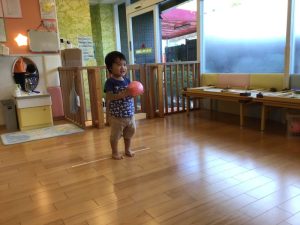 保育者目がけてボールをポイッ![]()