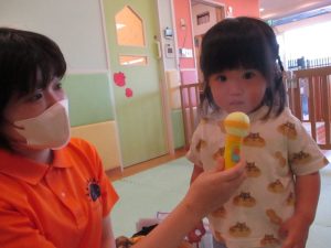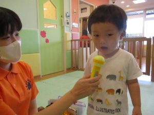 What is your name? How are you?と聞かれて、お名前や今日の気持ちを答えます🎤