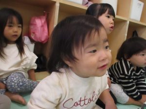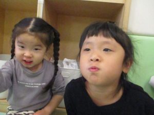 『葉っぱをふーってふいてみて。ふーっ!』の言葉に合わせて、子どもたちも一緒に・・