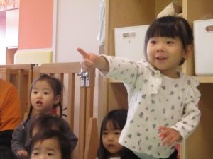 身近な秋の自然が満載な絵本に『足がまつぼっくりになってる!』『手がどんぐり!!』と発見を楽しんでいました![]()