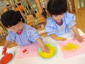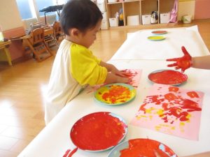 いちご組さんは先日『ばけばけはっぱしよう!』と絵の具あそびを楽しみました![]()