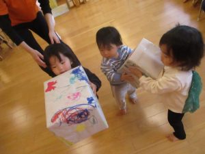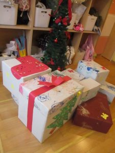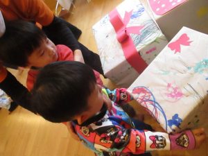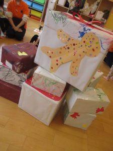 (こちらのプレゼントは先日みんなでお絵描きをしたりシール貼りをしたりして作ったものです
