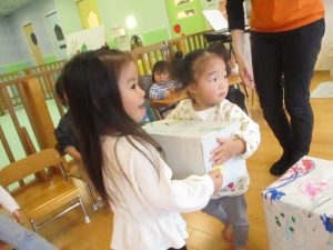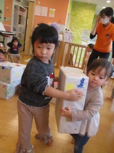 お友だちとペアになり、大きなプレゼントをクリスマスツリーのところまで運びます![]()